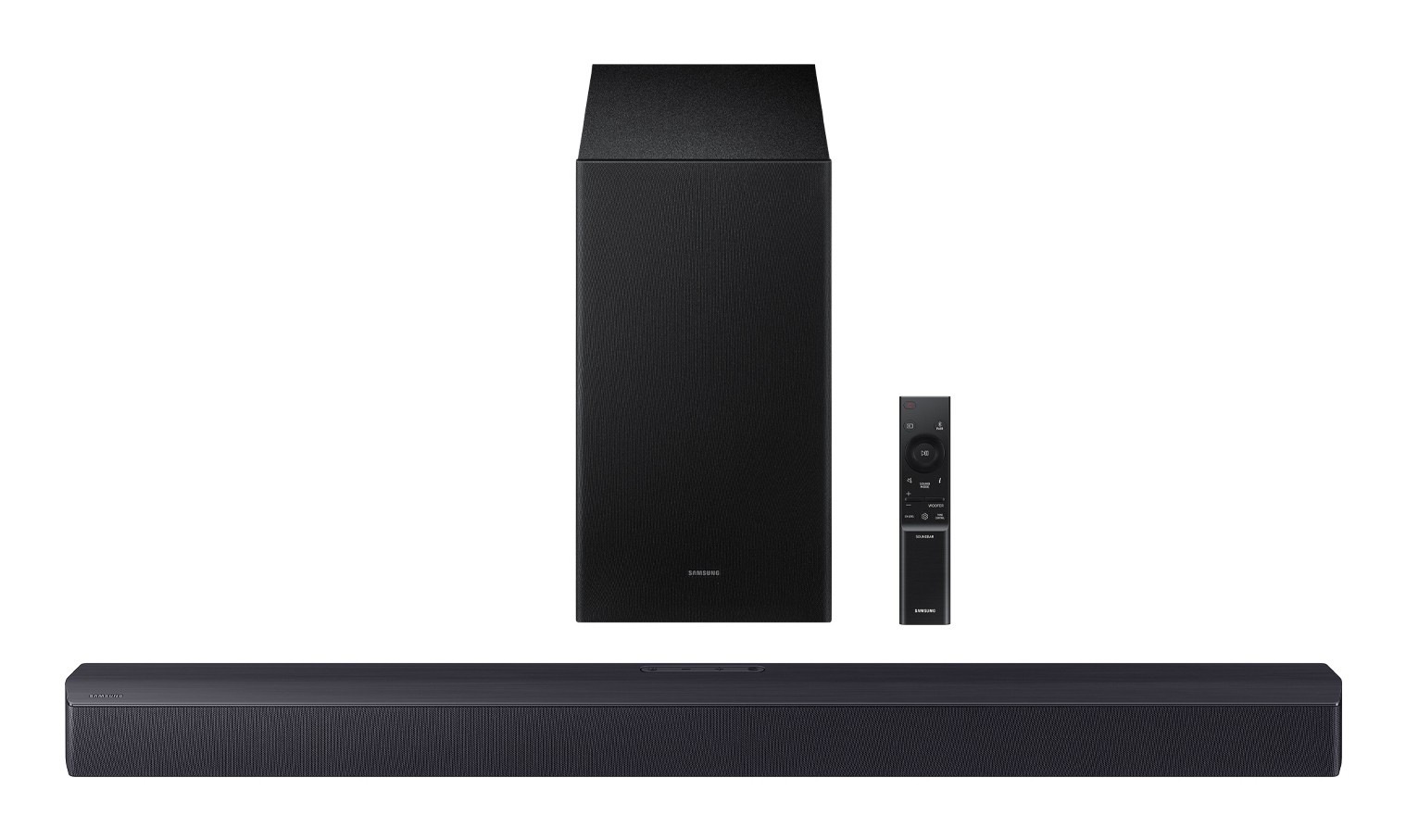 Samsung B-Series Barra de sonido B450F Serie B 2.1 con Subwoofer y Dolby 2.0 2025. Canales de salida de audio: 2.1 canales, Decodificadores incorporados: DTS Virtual:X, Dolby 2.0, Dolby Audio, Modos de ecualización: Adaptive Lite, Refuerzo de graves, Game Pro, Estándar, Expansión de sonido envolvente. Conectividad del altavoz de subgraves (subwoofer): Inalámbrico. Color del producto: Negro, Nombre del color: Titan Black, Formatos de audio soportados: AAC, AIFF, FLAC, MP3, OGG, WAV. Tecnología de conectividad: Inalámbrico y alámbrico. Consumo eléctrico de la barra de sonido: 25 W, Consumo de energía del altavoz potenciador de graves: 40 W, Consumo de energía (inactivo): 0,5 W