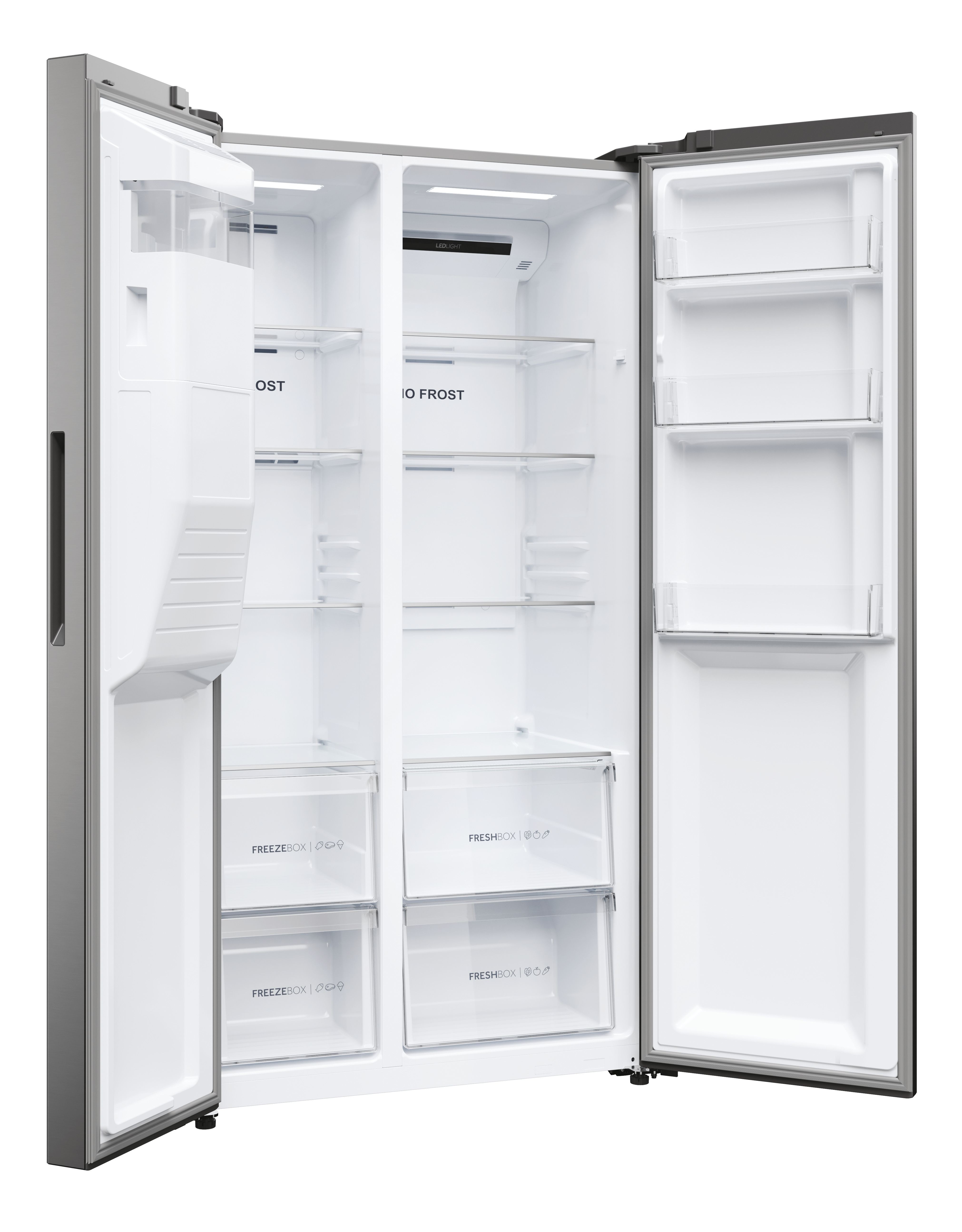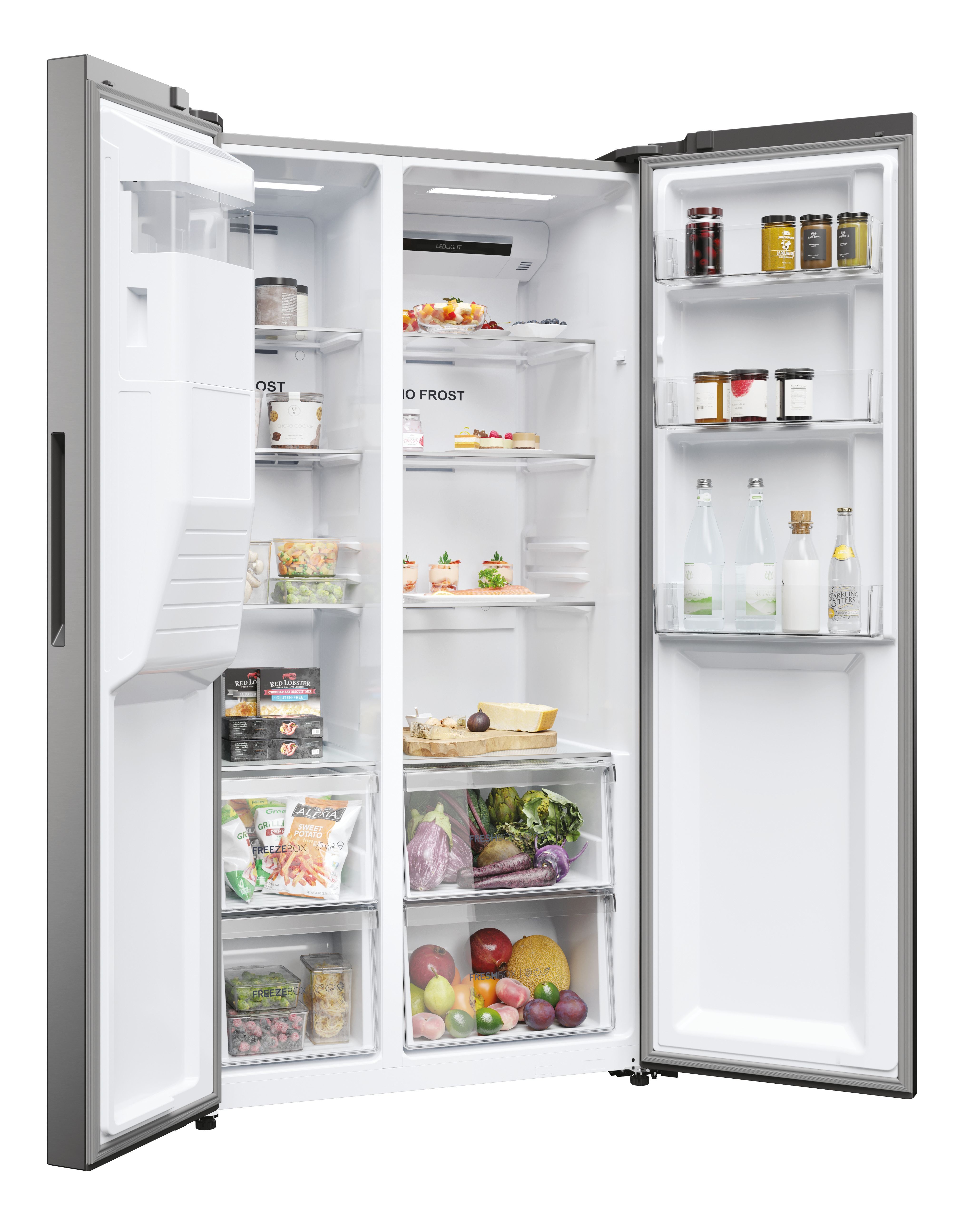 Haier SBS 90 Serie 5 HSR5918DIMP, Independiente, Puerta americana, Platino, Acero inoxidable, 2 puerta(s), R600a, Vidrio