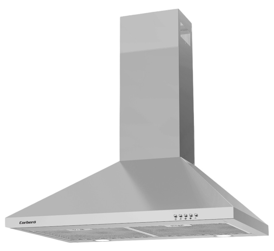 Campana Corbero KURAMATHI760X, Decorativa Pirámide Inox, 70 cm, Pulsador, Caudal 621,71 m3/h, 165W, 3 Velocidades, 2 X Filtro de Aluminio, Filtro Carbón, Eficiencia Energética A, 465X700X180 mm.