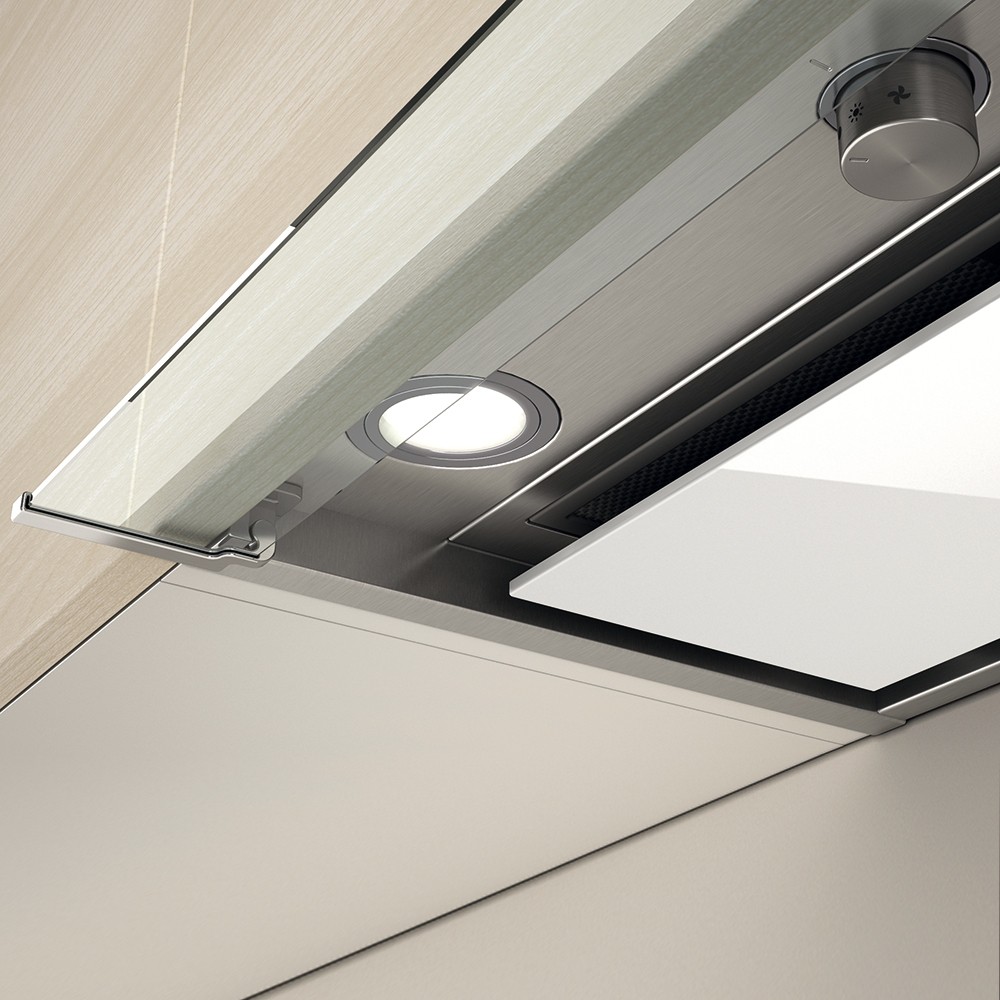 Campana Elica BOXIN PLUS IXGL/A/90, Encastre, B, 3+1 V, 90 cm, 610 m3/h (Int), 70 db(A) (máx), Acabado Acero+cristal Blanco, Mando mecánico, Bombilla Led, aspiración perimetral