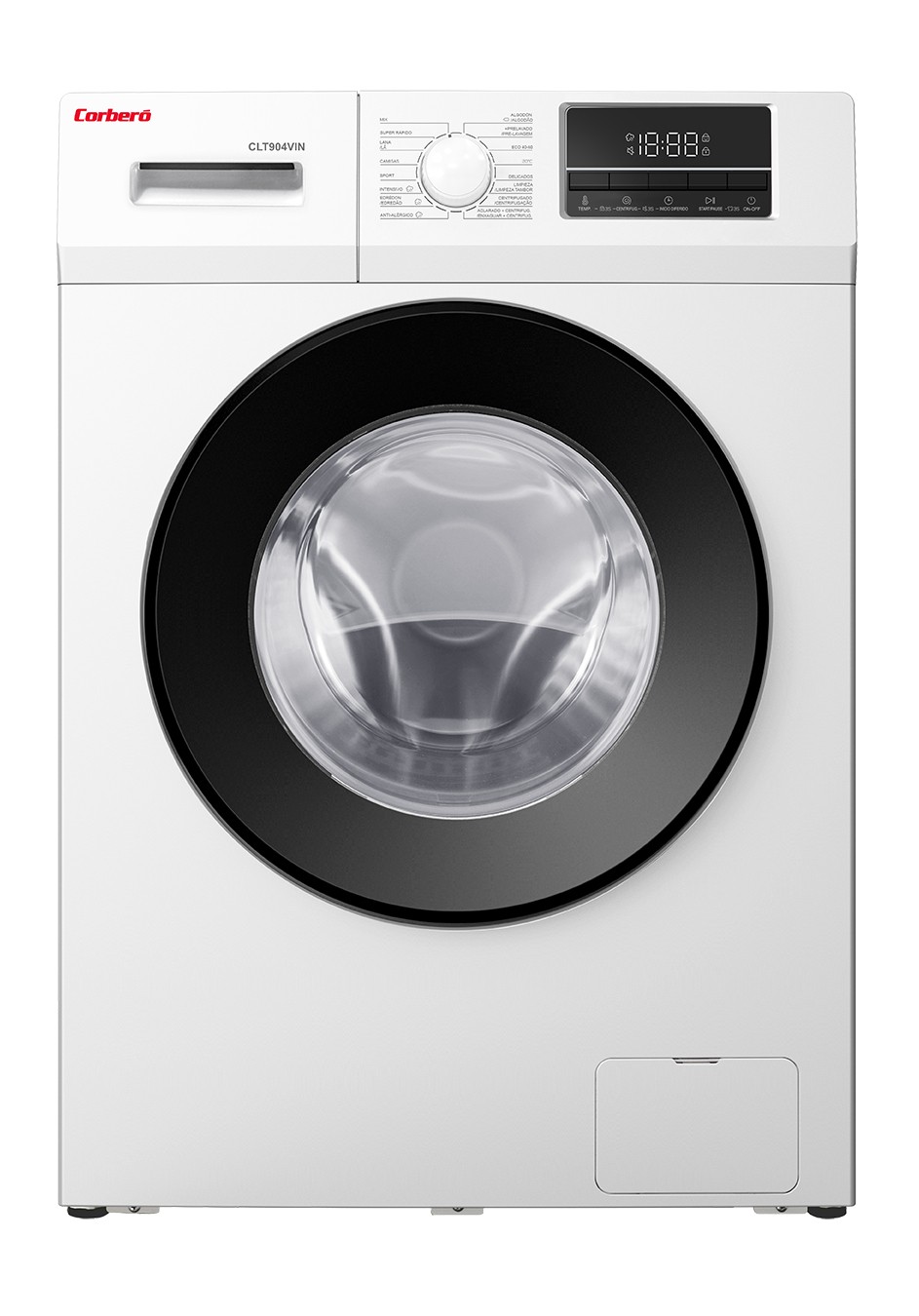 Lavadora Corbero CLT904VIN, Carga Frontal, 9 Kg, 1400 Rpm, Motor Inverter, Color Blanco, 16 Programas, Vapor, Antialérgico, Inicio diferido 3-24 Horas, Lavado Rápido de 15-30 Min., Puerta XXL, Eficiencia Energética A, 560X600X850 mm.