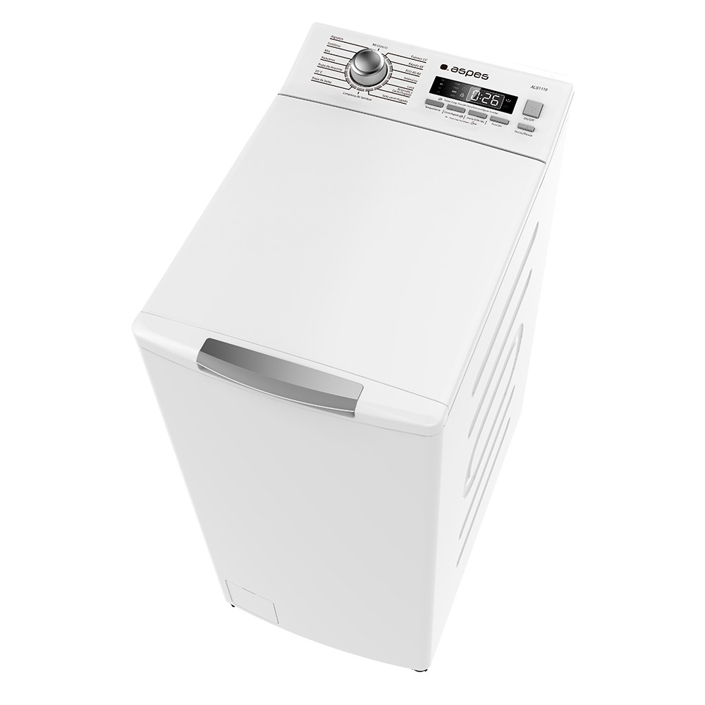 Aspes ALS1118. Tipo de carga: Carga superior. Capacidad nominal: 8 kg, Clase de secado por giro: B, Nivel de ruido (spin): 80 dB, Nivel de ruido (lavado): 64 dB, Máxima velocidad de centrifugado: 1300 RPM. Color del producto: Blanco. Ancho: 400 mm, Profundidad: 610 mm, Altura: 875 mm. Clase de eficiencia de energía: C