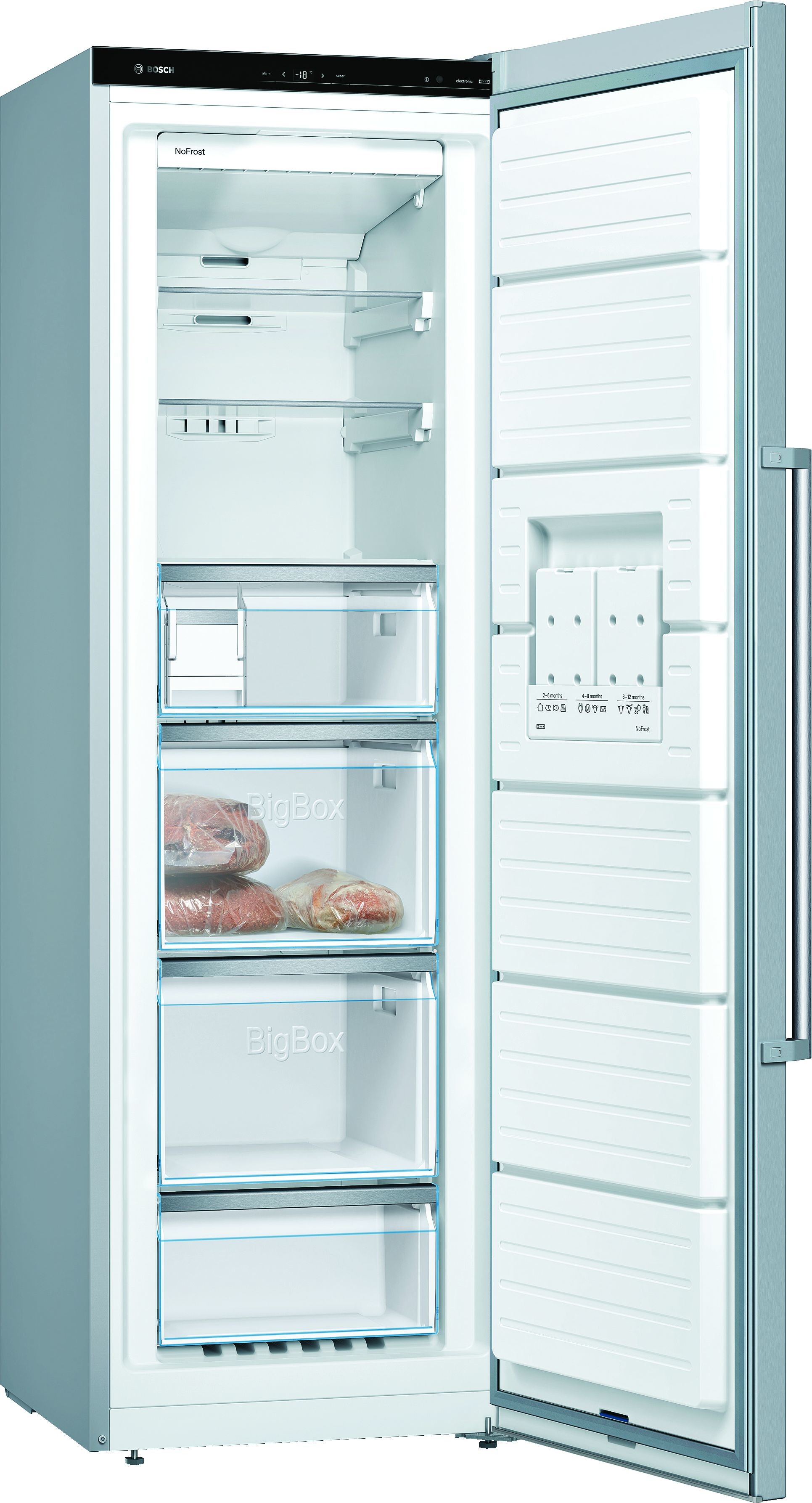Bosch Serie 6 GSN36AIEP. Congelador, capacidad neta: 242 L, Clase climática: SN-T, Capacidad de congelación: 20 kg/24h, Tiempo de almacenamiento en caso de fallo de alimentación: 25 h, Nivel de ruido: 39 dB, Índice Star: 4*, Sistema de descongelado. Bisagra para puerta: Derecho. Tipo de lámpara: LED. Clase de eficiencia de energía: E, Consumo de energía anual: 234 kWh. Color del producto: Acero inoxidable