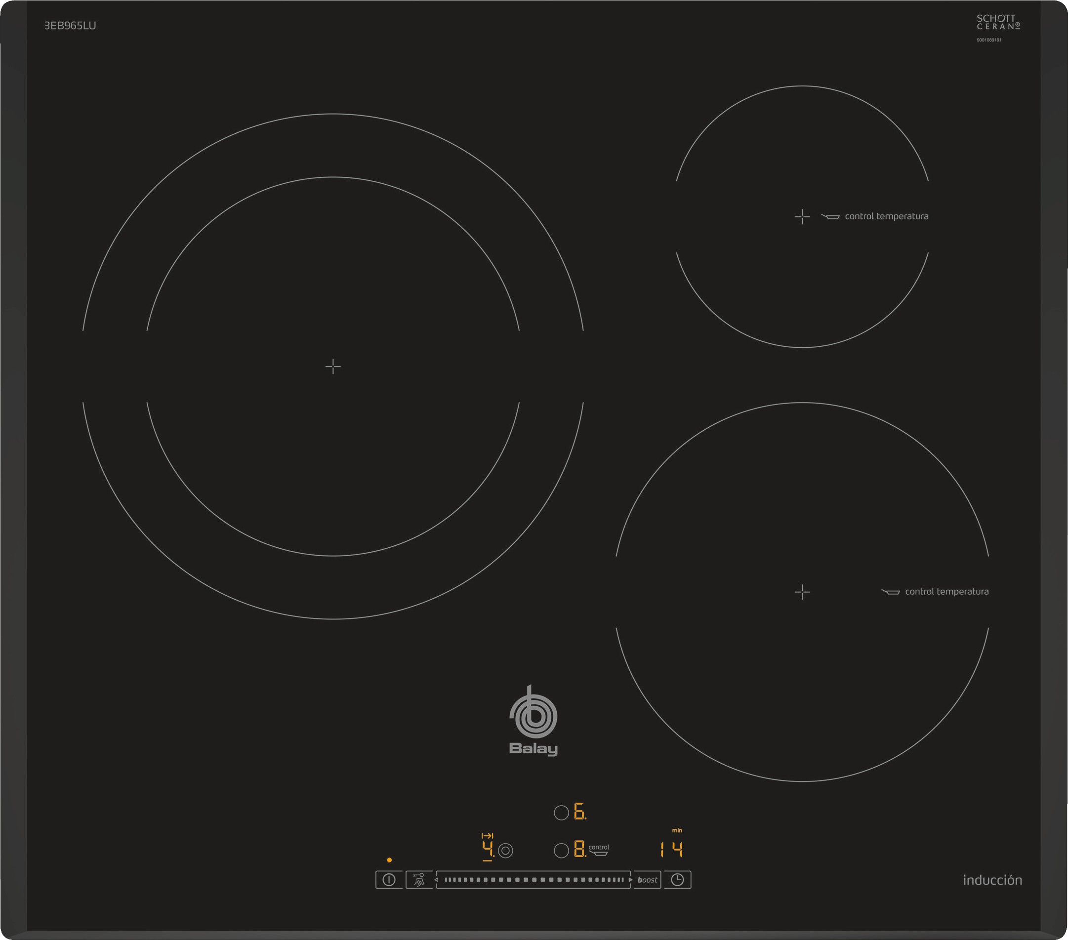 Induccion Balay 3EB965LU, 60 cm., 3, Negra/Biselada, Control Deslizante, zona de 28 cm., control de tª en zonas 15 y 21 cm.