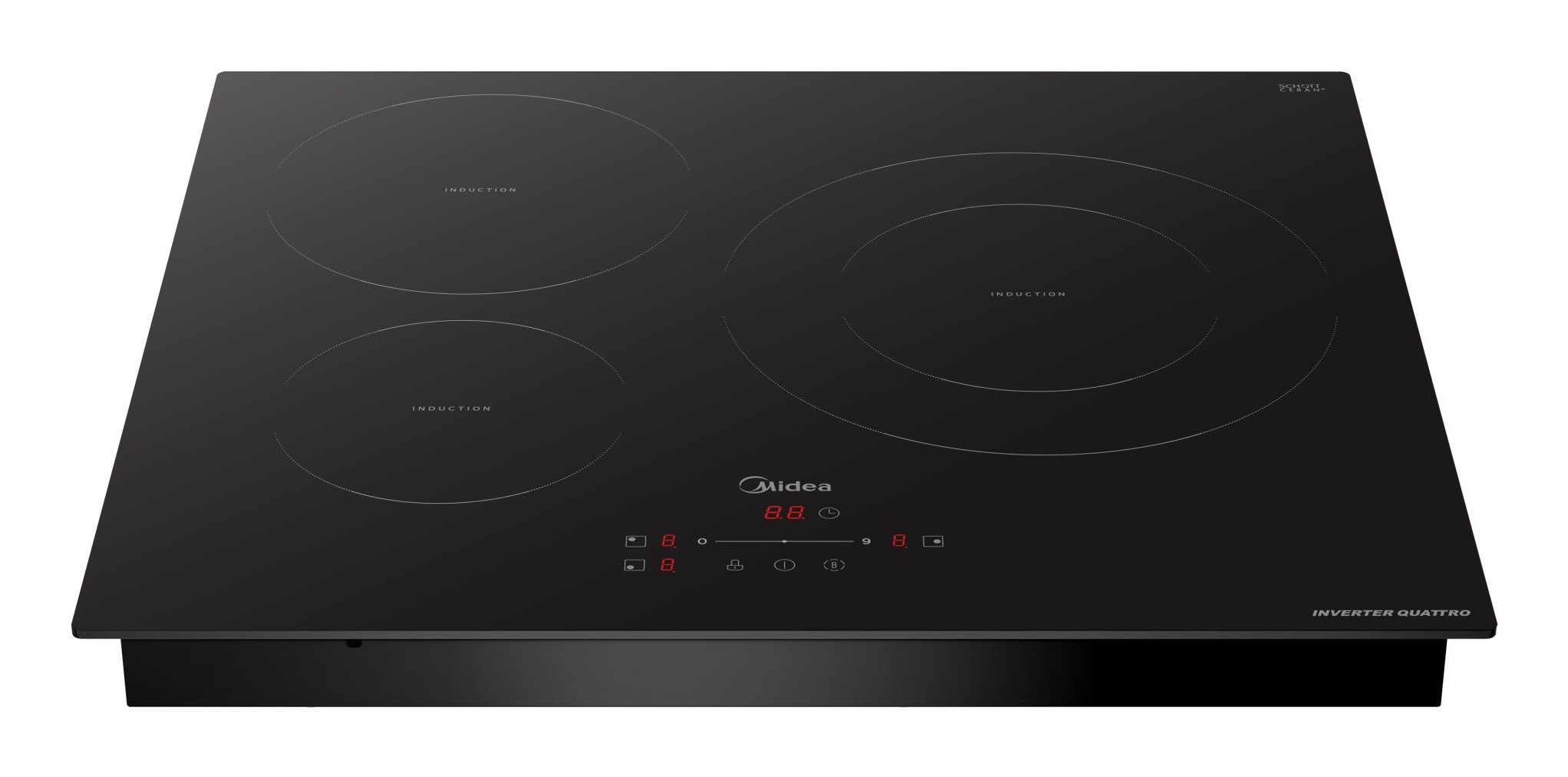 Induccion Midea MIH740T278K0, 60 cm, 3 Zonas (1 x 29cm + 1 x 21cm + 1 x 16cm), 7400W, Cristal negro, Control deslizante, 9 niveles de potencia