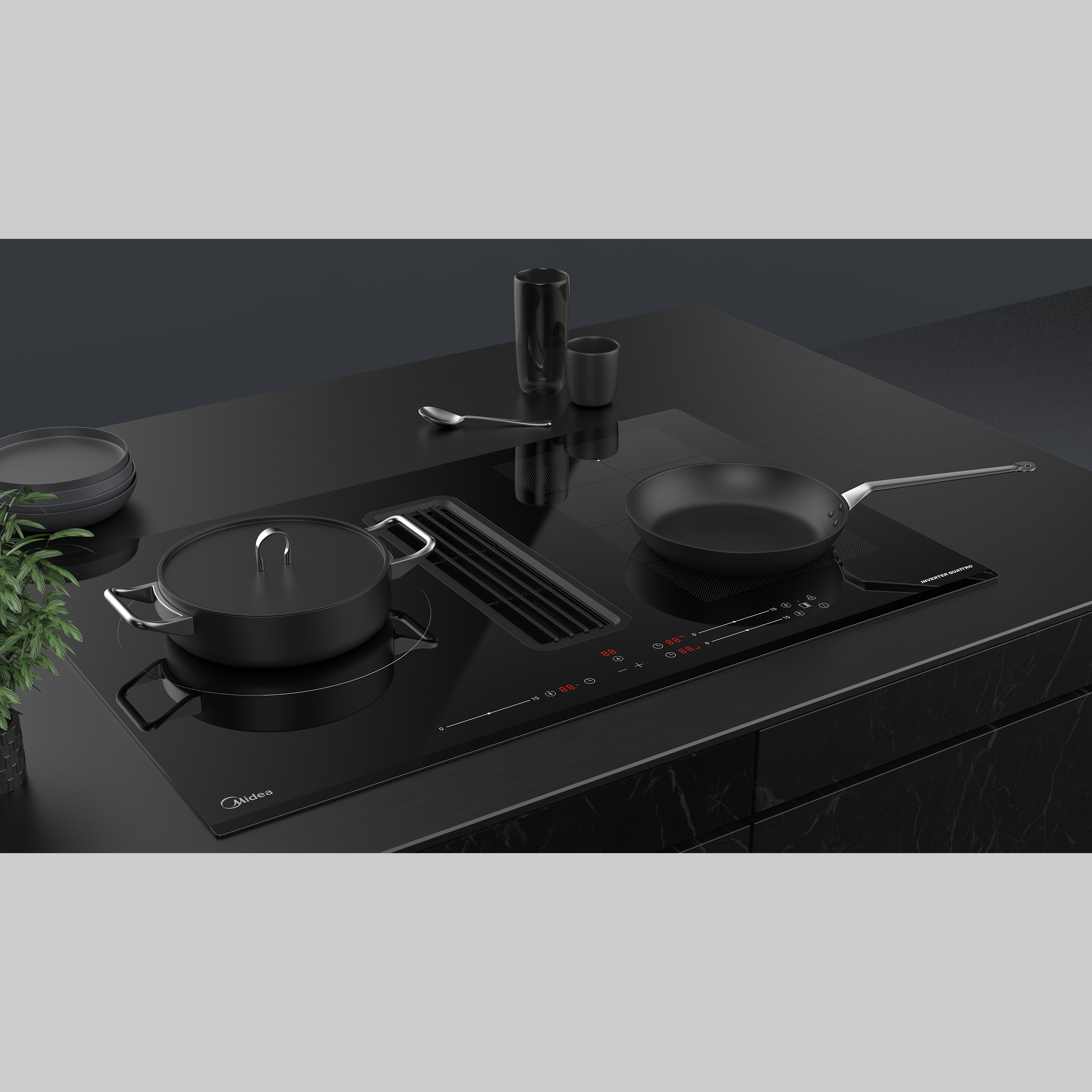 Induccion Midea MIH740Y078B, 80 cm, Extractor integrado (630 m³/h), 2 Zonas flex (38 x 22 cm), 7400W, Negro, Control deslizante, 15 niveles de potencia