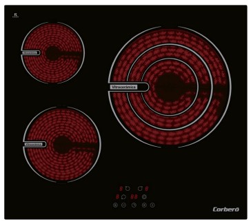 Vitro Corbero CCVG3BL574, 3 Zonas, Potencia 5700 W, Control Touch Control, Zona Grande 30 Cms, Triple en Zona Grande, Temporizador 99 Minutos, 9 Niveles Potencia, Desconexión Automática de Seguridad, Bloqueo de Seguridad Para Niños, 520X590X50 mm.