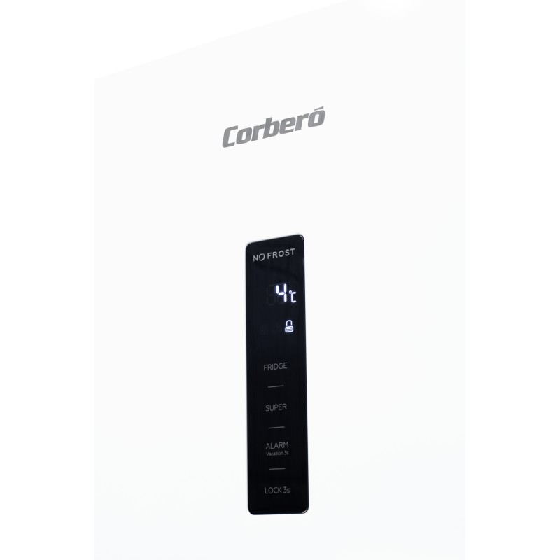 Frig 1p Corbero CCLH18524NFW, 359L, No Frost, Color Blanco, Display Puerta, Luz LED, 2 Crisper XXL, Fresh Box, 4 Botelleros, Tirador Easy Open, Silver Trim, 40 Db, Eficiencia Energética D, 650x595x1850 mm.