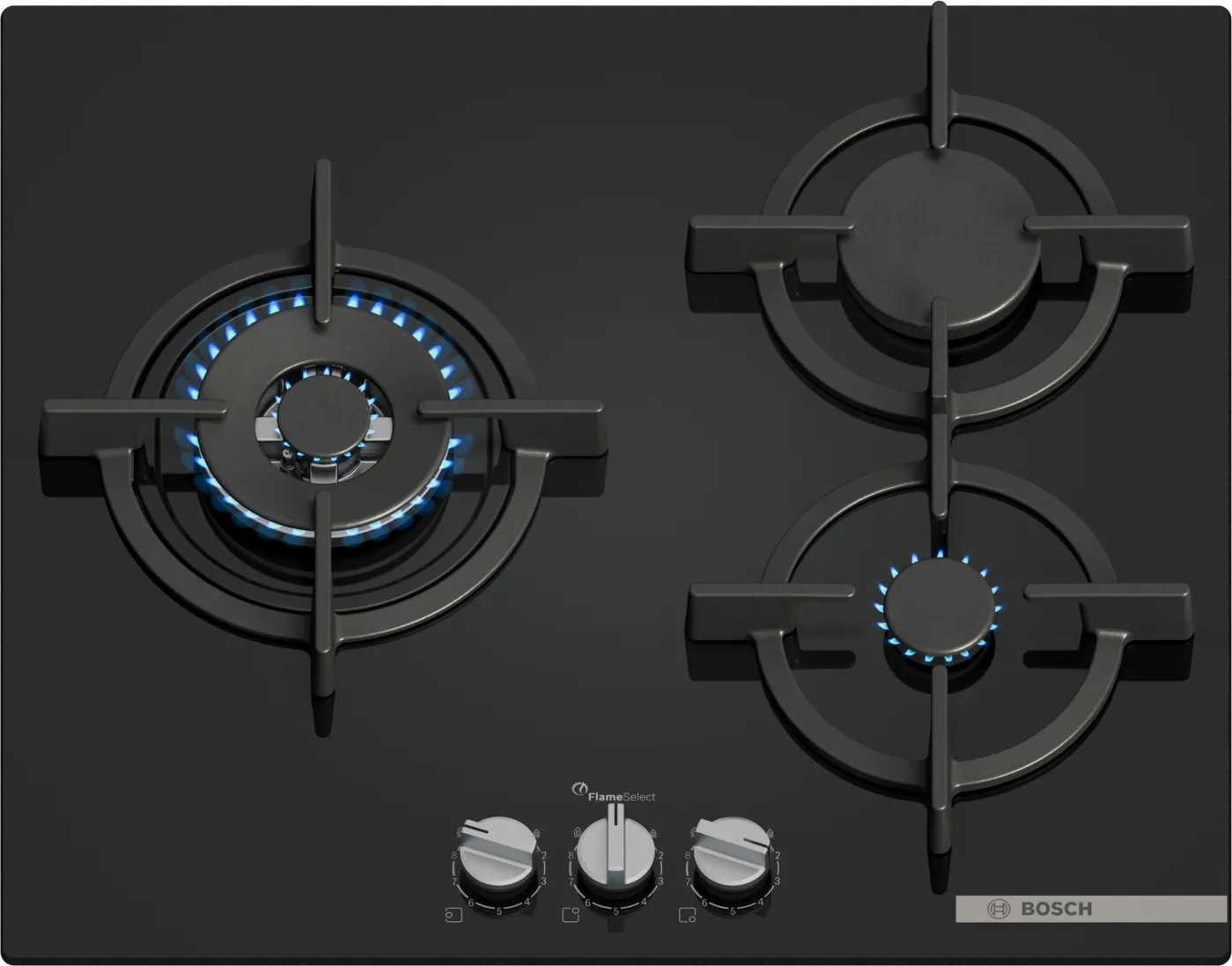 Placa Bosch PPC6A6I10, Gas, 60 cm., 3 quemadores, Cristal templado negro, FlameSelect, wok 4 kW., gasStop, parrillas hierro fundido aptas lavavajillas, autoencendido.