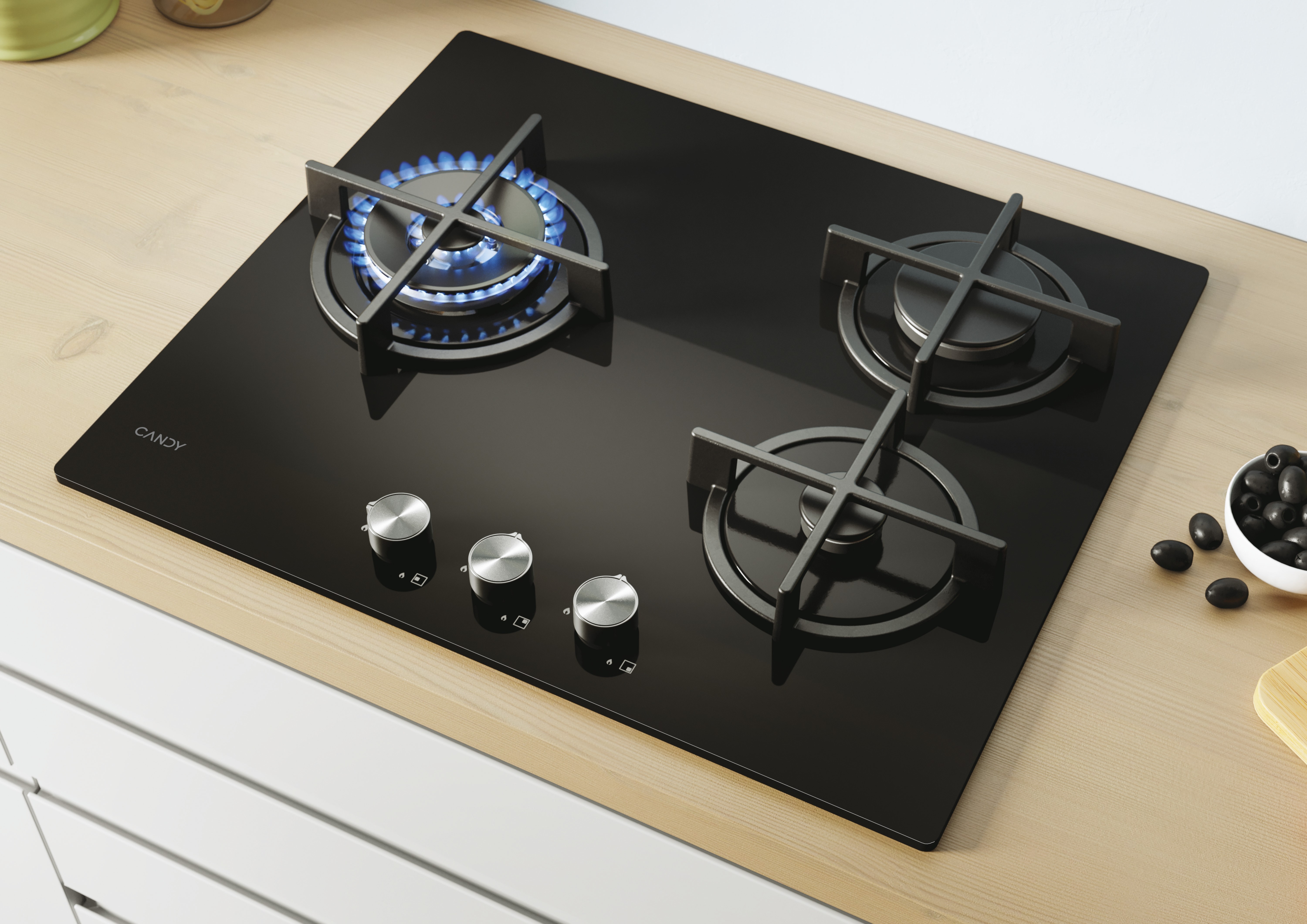 Candy Moderna CSG63B4PB, Negro, Integrado, 56 cm, Encimera de gas, Vidrio templado, 3 zona(s)