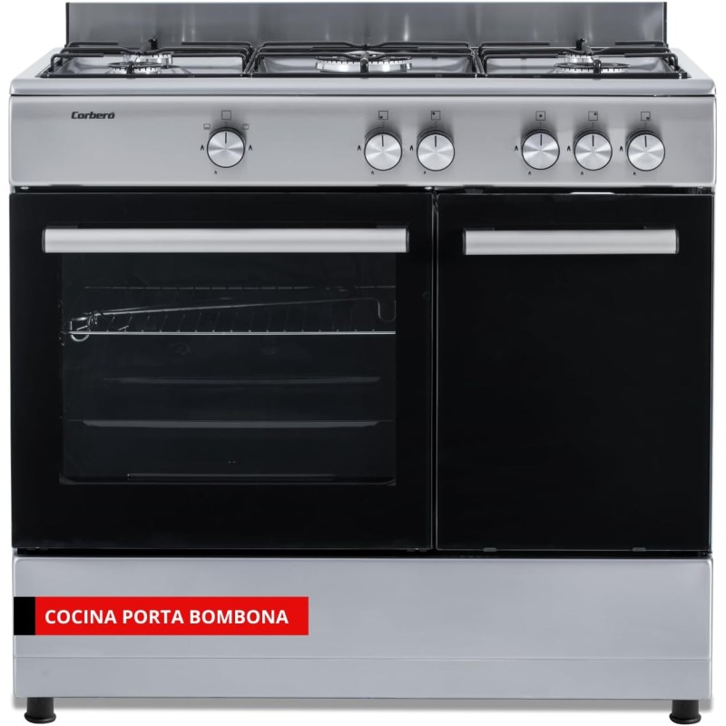 Cocina Corbero CC510GB90X, Capacidad 60L, Gas Butano, Color Inox, 5 Fuegos, Wok Fuego Medio, Porta bombona, Cajón Calientaplatos, Tapa Inox tipo Splash Back, Puerta Horno Doble Cristal, Bandeja Y Parrilla Cromada , 610x900x925 mm.