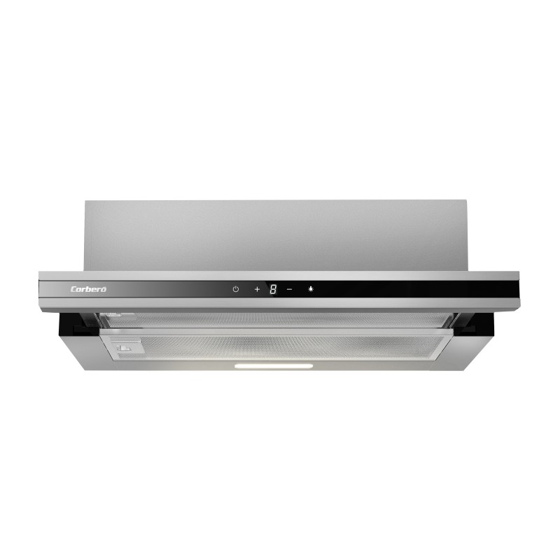 Campana Corbero MAKALU640X, Telescópica Inox&Negro, 60 cm, Control Touch, Caudal 372,2 m3/h, Potencia 70W, 3 Velocidades, 2 X Filtro de Aluminio, Filtro Carbón, Eficiencia Energética A, 284X600X194 mm.