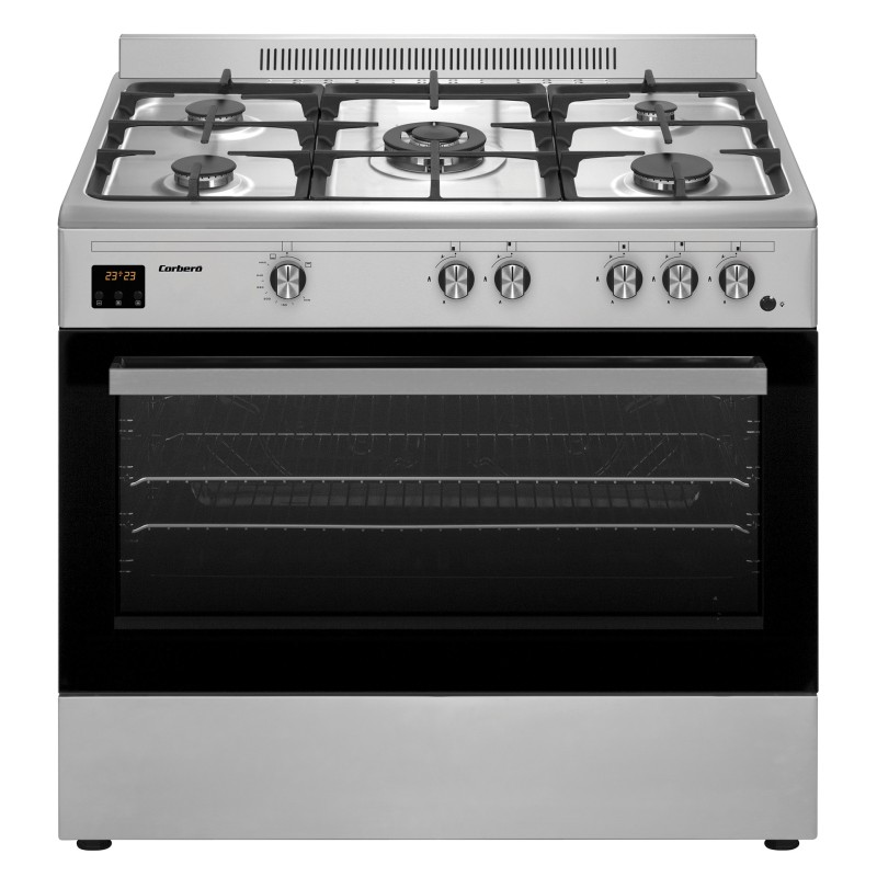Cocina Corbero CC900X, Horno a Gas de 96L, Gas Butano, Color Inox, 5 Fuegos, Autoencendido, WOK, Tapa Inox tipo Splash Back, Cajón Calientaplatos, Termostato, Reloj Digital, Guías Telescópicas, Luz Interior, 610x900x925 mm.