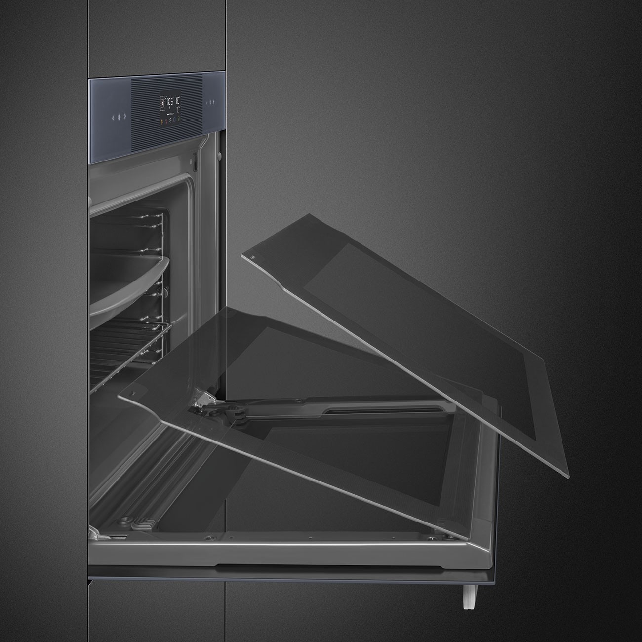 Smeg Linea SO6102S3PG. Tamaño del horno: Medio, Tipo de horno: Horno eléctrico, Total capacidad interior, horno (s): 67 L. Tipo de instalación: Integrado, Color del producto: Gris, Tipo de control: Tocar. Tipo de reloj: Electrónico, Tipo de temporizador: Digital, Modos del temporizador: Tiempo de cocción, Fin de cocción, Temporizador. Clase de eficiencia de energía: A++, Consumo de energía (convencional): 0,96 kWh, Consumo de energía (convección forzada): 0,51 kWh. Cantidad de lámparas: 2 lámpara(s), Tipo de lámpara: Halógeno, Iluminación ubicación: Lado