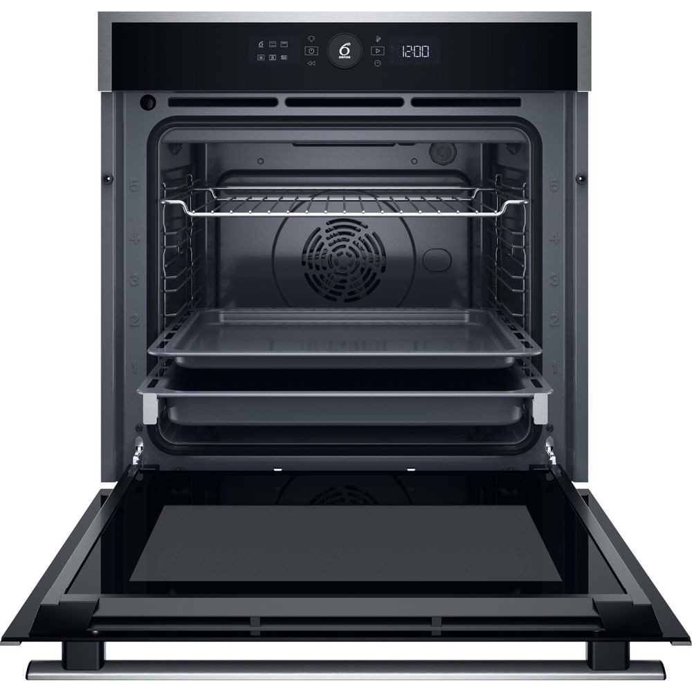 Whirlpool WOI4S8HM1SXA. Tamaño del horno: Medio, Tipo de horno: Horno eléctrico, Total capacidad interior, horno (s): 73 L. Tipo de instalación: Integrado, Color del producto: Negro, Acero inoxidable, Tipo de control: Tocar. Tipo de temporizador: Digital. Clase de eficiencia de energía: A+, Consumo de energía (convencional): 0,67 kWh, Consumo de energía (convección forzada): 0,9 kWh. Cantidad de lámparas: 1 lámpara(s), Tipo de lámpara: Halógeno, Iluminación ubicación: Parte trasera