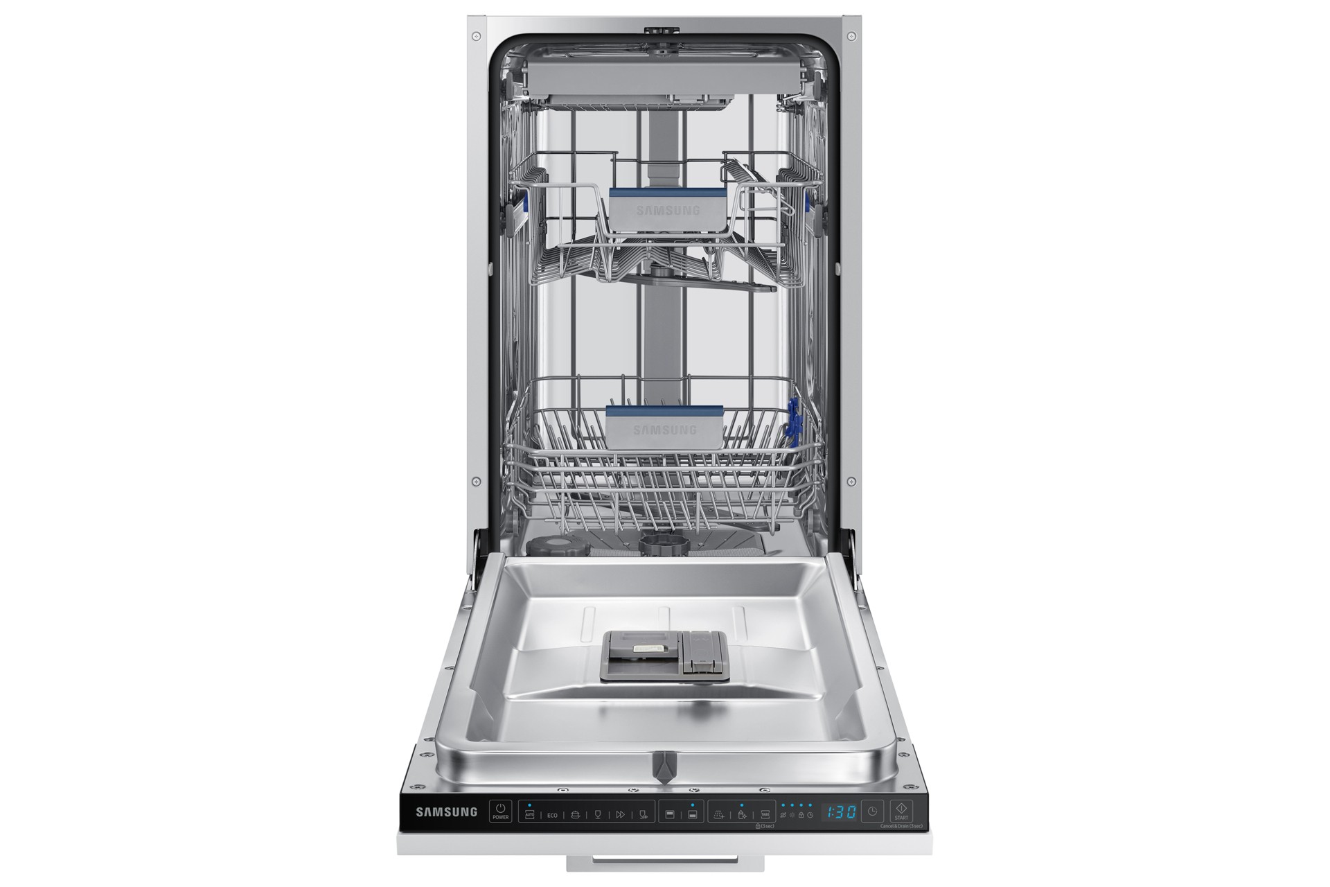 Samsung Lavavajillas Integrable 45cm 10 cubiertos Clase D Blanco DW50DG450B00ET, Completamente integrado, Estrecho (45 cm), Negro, Tocar, 2 cesta(s), Cajón