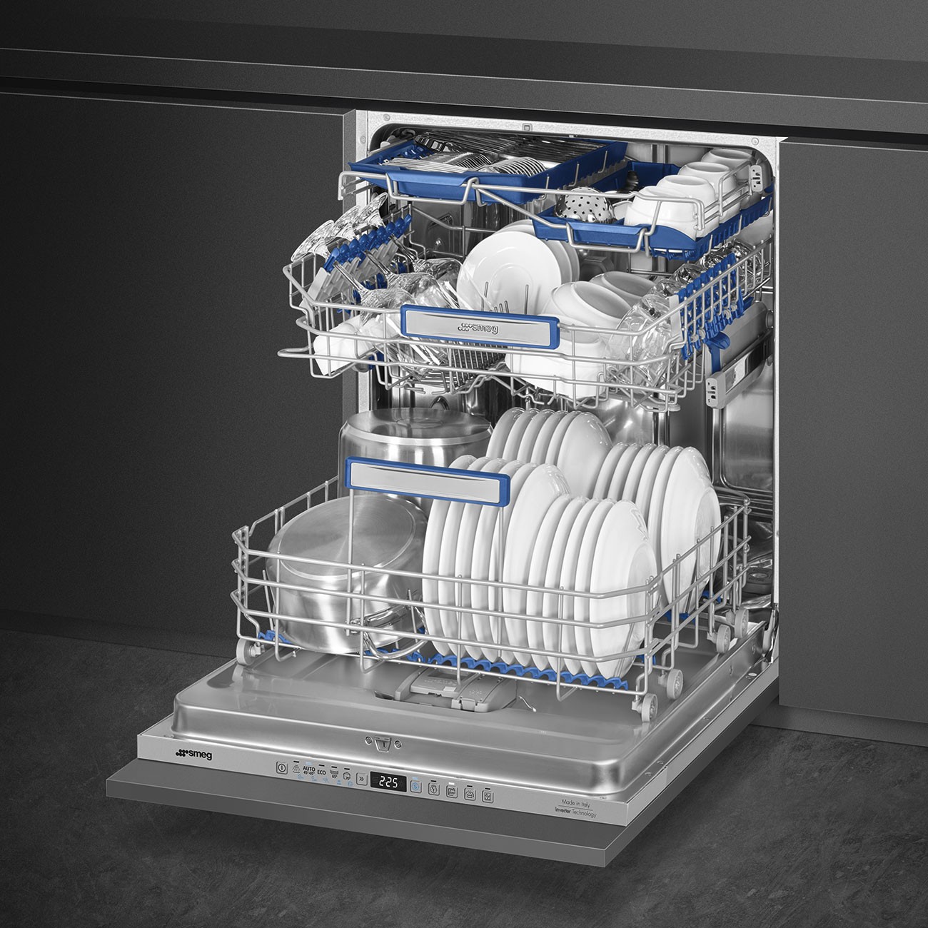 Smeg STL323BL. Tipo de instalación: Completamente integrado, Talla del producto: Tamaño completo (60 cm), Color de la puerta: Plata. Número de cubiertos: 13 cubiertos, Clase de emisión de ruido: B, Nivel de ruido: 42 dB. Ajuste de patas: 7 cm, Color de luz de fondo: Azul / Blanco. Clase de eficiencia de energía: B, Consumo de agua por ciclo de lavado: 9 L, Consumo de energía por 100 ciclos: 63 kWh. Ancho: 598 mm, Profundidad: 545 mm, Altura: 818 mm