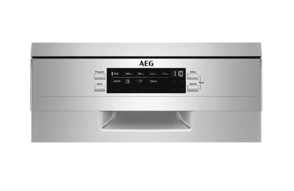 Lavavajillas AEG FFB62427ZW, E, 9 cubiertos, Airdry, Display digital, Cesto de cubiertos, Brazo aspersor satélite, Softspikes, Brazo aspersor doble, Programa Auto, 30 min, Extrahigiene, Machine Care, motor inverter, 46 dB, Blanco