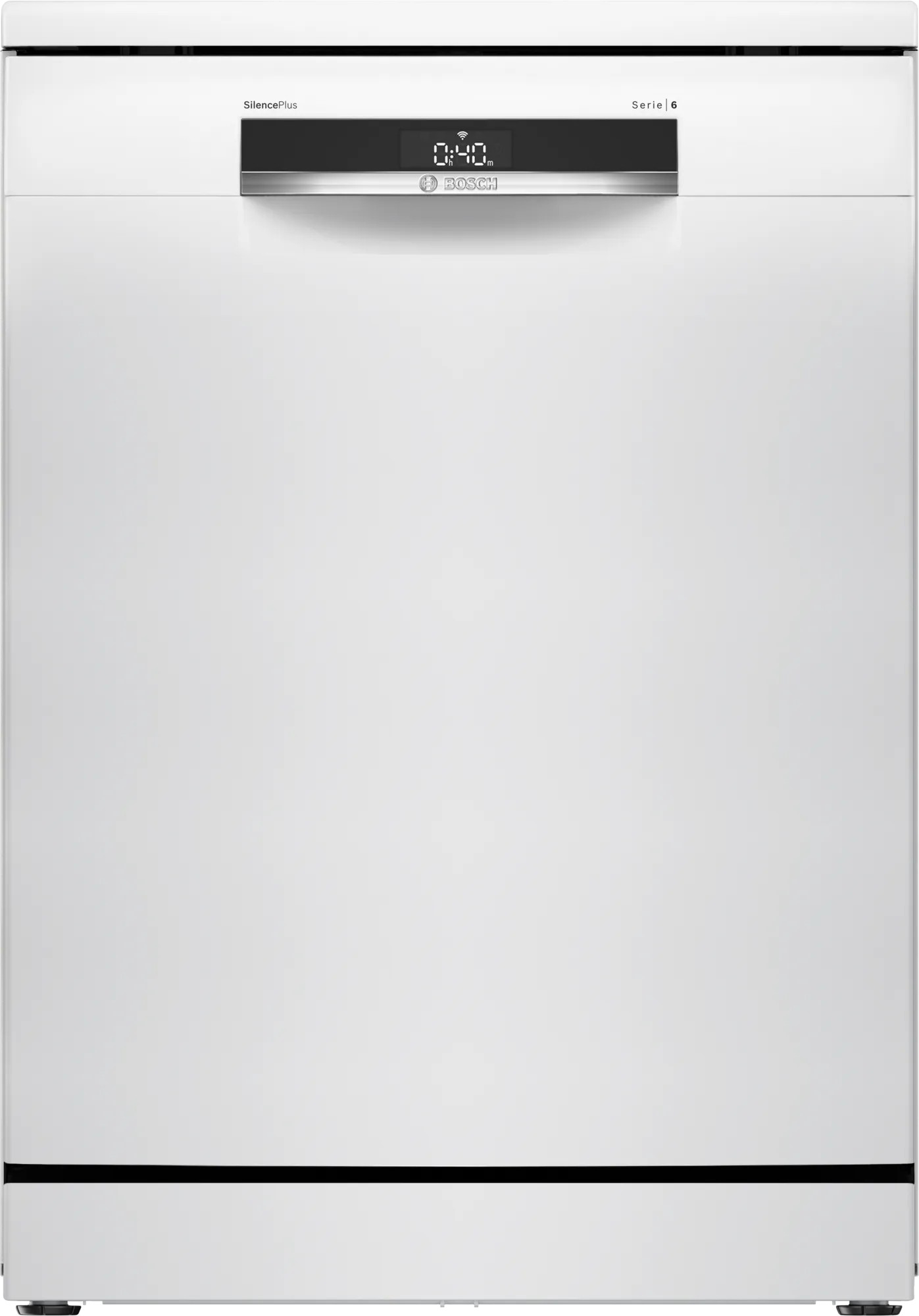Lavavajillas Bosch SMS6ECW15E, A, Libre instalación, 84,5x60 cm, 14 servicios, HC, Blanco, 9,0 l, 42 dB, Display frontal y sup. c/ teclas, Secado Eficiente, Z. ExtraClean, 6 progr. (Eco/Auto/Int./ráp. 60°C/Silen./Fav.), 5 opc. (Ex.Secado/½carga/SpeedP.+