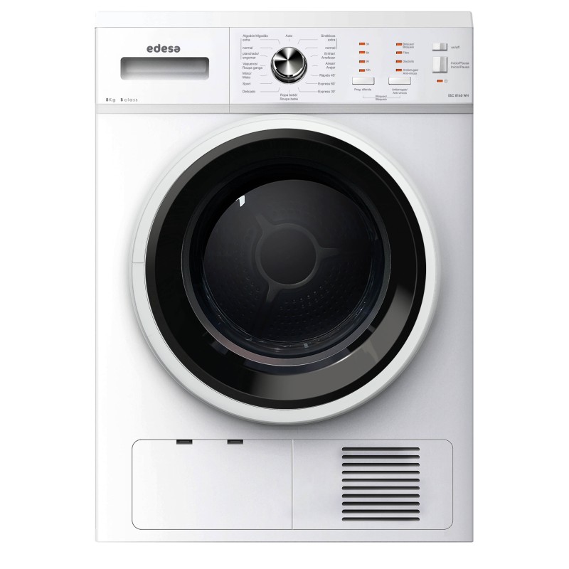 Secadora Edesa ESP8150WH, carga frontal Sistema de secado por bomba de calor Capacidad de secado de 1 a 8 kilos Sistema Reversing: giros alternos del tambor para un secado más uniforme Consumo variable en función de la carga A Bloqueo seguri