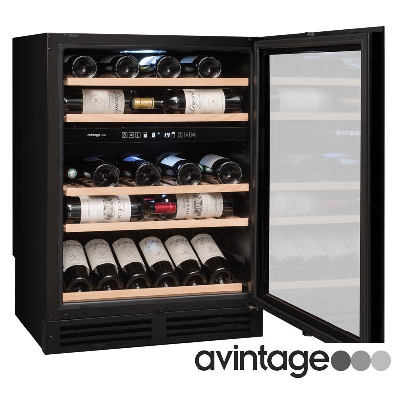 Vinoteca Integrable AVINTAGE AVI47XDZA, 52 botellas, "integrable en COLUMNA", 2 zonas ajustables de 5° a 18°C, 4 bandejas de madera maciza deslizantes y 1 de presentación, termostato y control electrónico, puerta reversible con triple cristal anti rayo