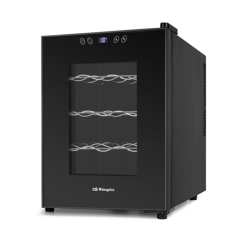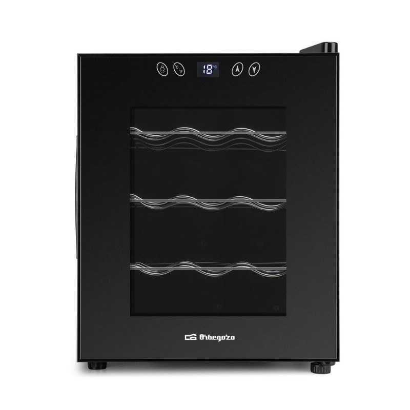 Vinoteca Orbegozo VT1230, 12 botellas, Luz interior LED, Pantalla digital LCD, Estantes cromados extraibles, 11-18º, 34.5x47x48 cm, AnxAlxFondo